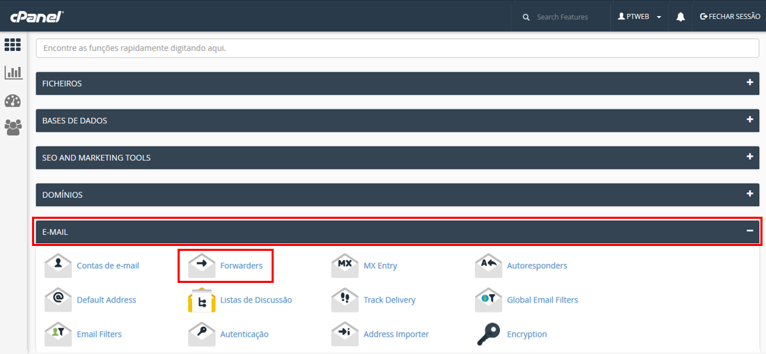 Para fazer o redirecionamentos de um email para outro email, entre no Cpanel da sua conta de alojamento e procure o separador "E-MAIL", depois de encontrar o separador email clique no Icon/Link "Forwarders" que está dentro do separador.