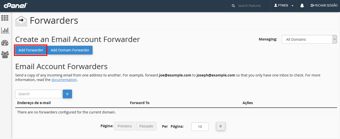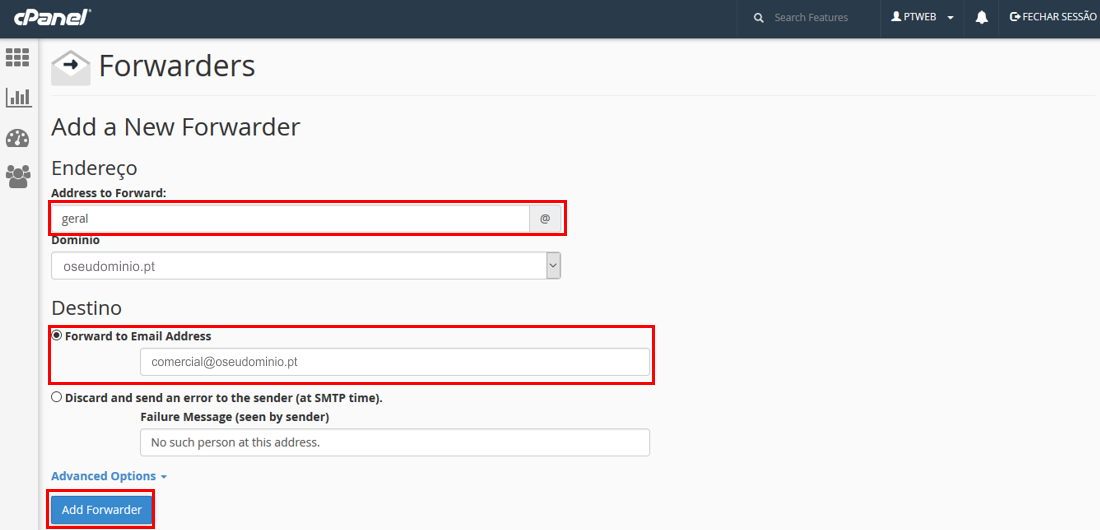 Depois de clicar em "Add Forwarder" será encaminhado para a área de Criação de Redirecionamentos.